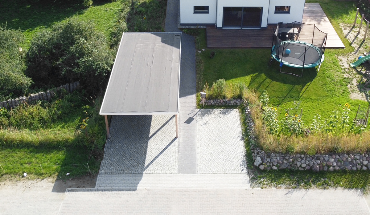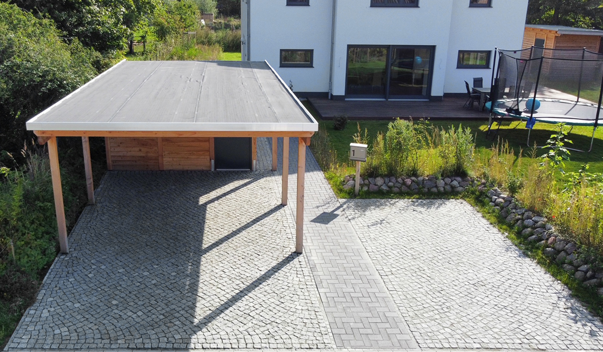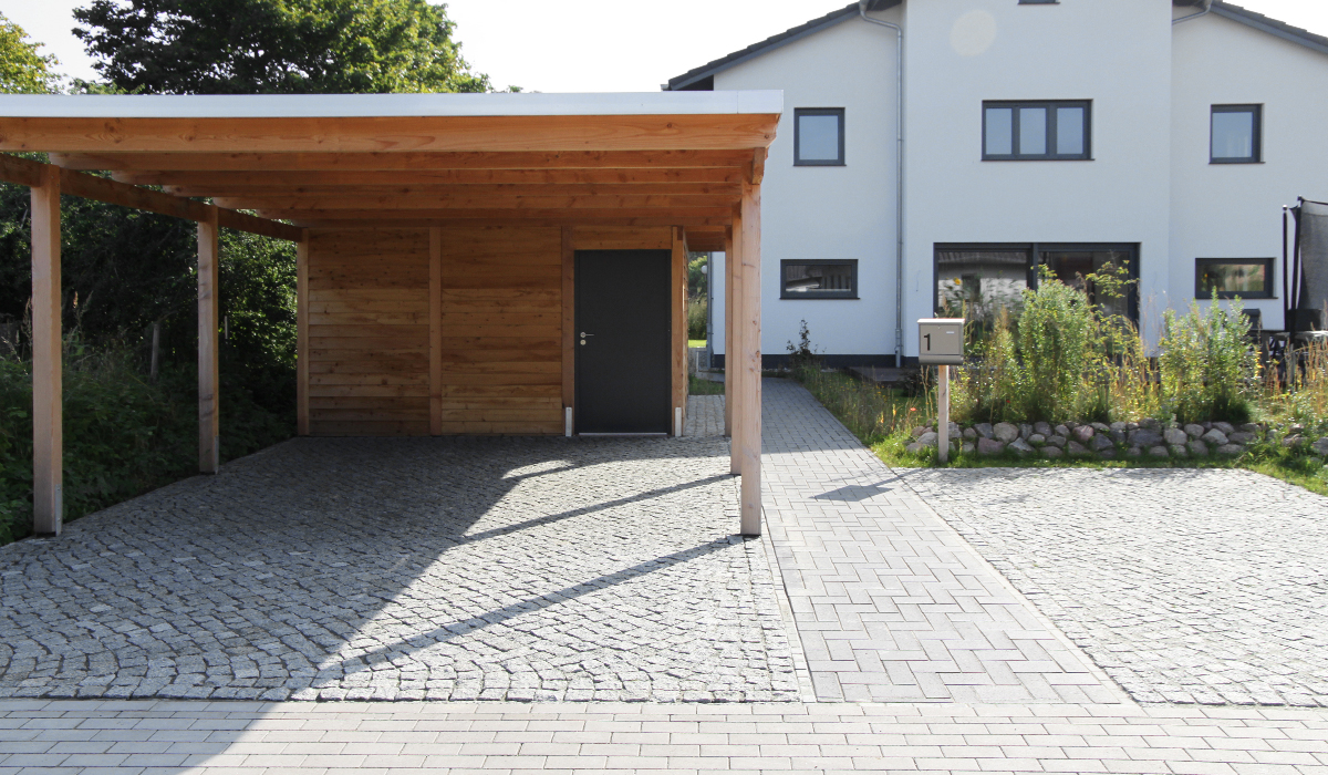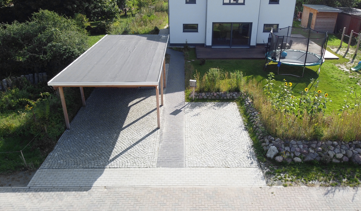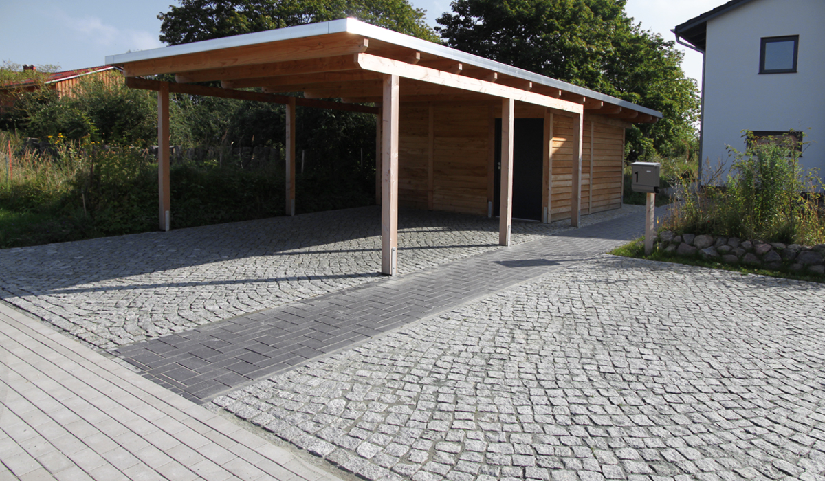 - Pflasterarbeiten für Wege inkl. Traufstreifen, Terrasse, Zufahrt und Stellplatz