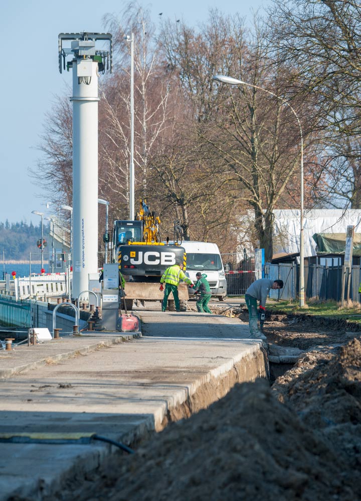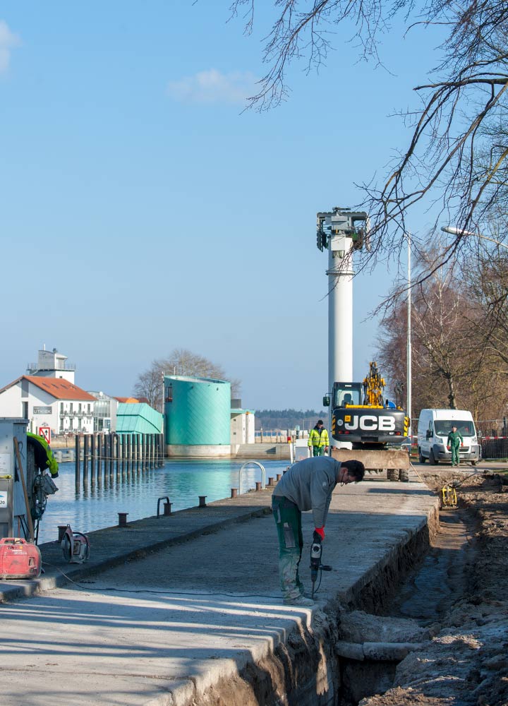 Zum Majuwi, in traumhafter Lage direkt am Ufer des Ryck gelegen, führt uns diese Baustelle. Bei besten Wetter verlegen wir neue Wasser- und Stromleitungen und erneuern den Straßenbelag. Neue Lampen gibt es auch noch.
