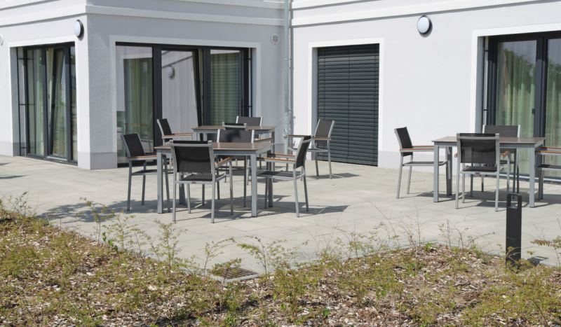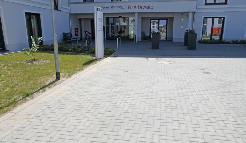 Im Zuge des Neubaus der Seniorenresidenz Greifswald wurden wir von Schneider Systembau mit den vorbereitenden Erdarbeiten, der Entwässerung, sowie Pflaster-, Boden- und Bepflanzungsarbeiten beauftragt. In diesem Rahmen haben wir Park- und Fahrflächen, Gehwege, sowie einen Terassenbereich angelegt.