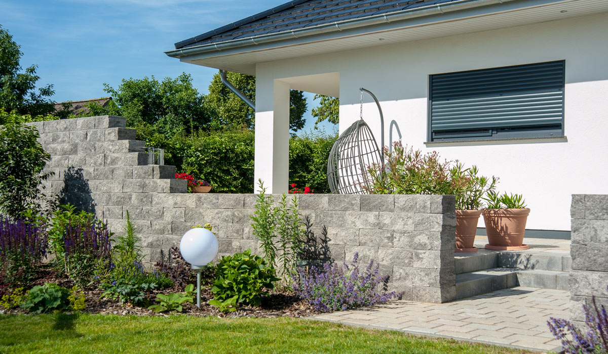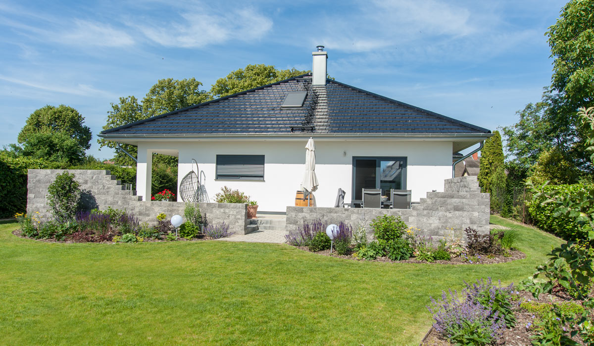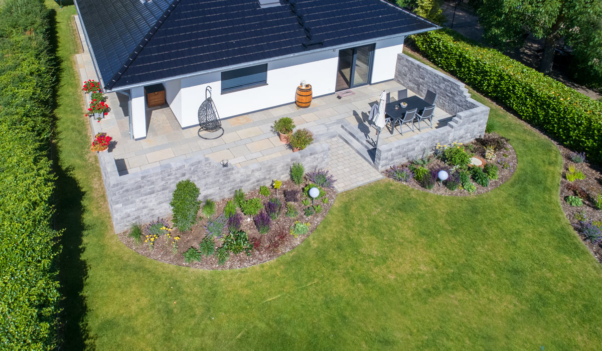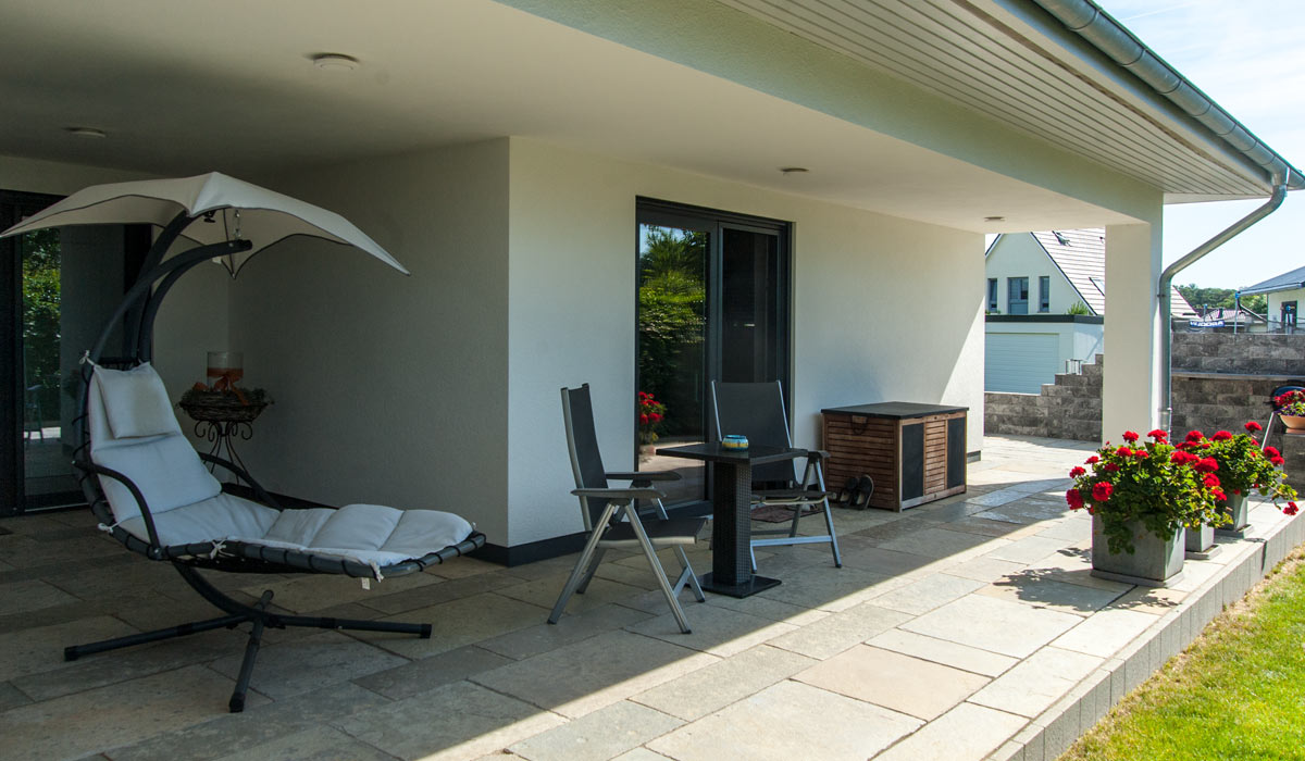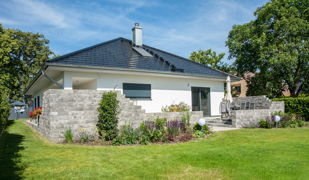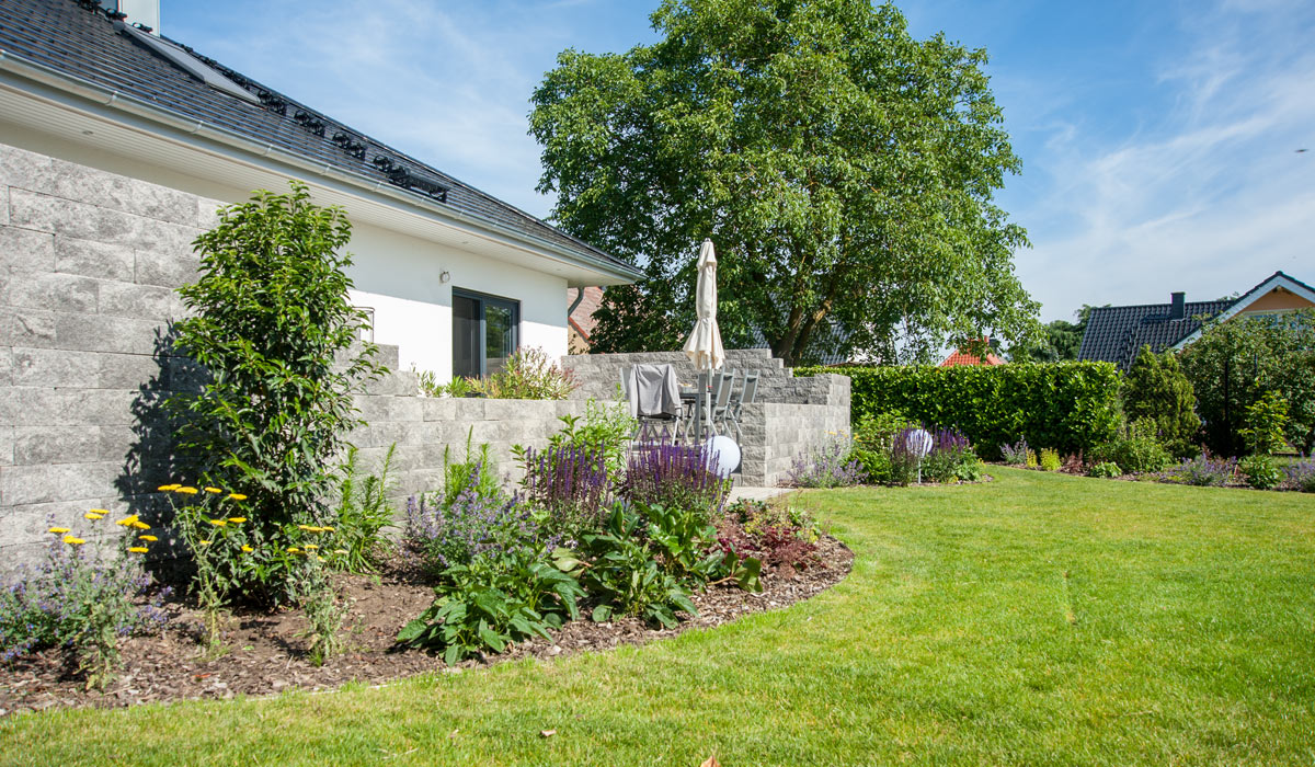Abgekämpft und ratlos nach einer langen, anstrengenden Planungsphase wandten sich die Bauherren an uns. Das Bauunternehmen Hahn GmbH hatte bereits die Erdarbeiten, den Rohrleitungsbau sowie die Bodenplatte zur Zufriedenheit fertiggestellt, nun planten wir gemeinsam die äußere Gestaltung. Schon bald trat wieder ein Lächeln in das Gesicht unserer Auftraggeber. Ab jetzt genießen Sie das sehenswerte Ergebnis.