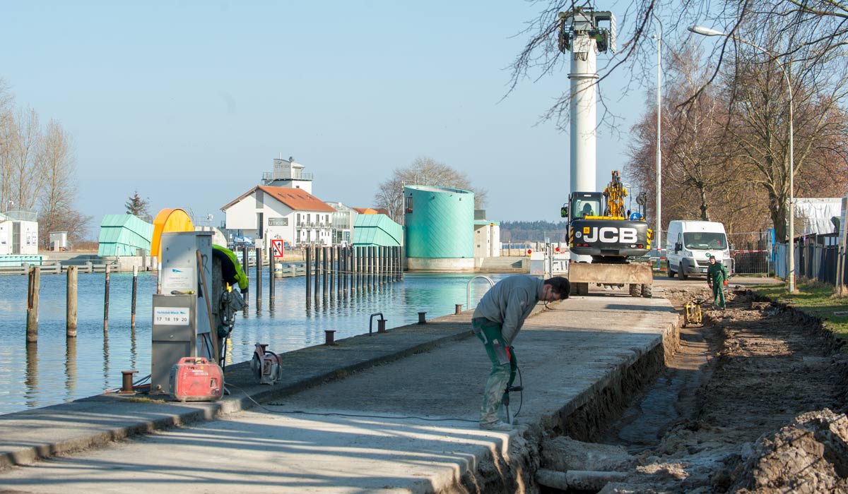 Zum Majuwi, in traumhafter Lage direkt am Ufer des Ryck gelegen, führt uns diese Baustelle. Bei besten Wetter verlegen wir neue Wasser- und Stromleitungen und erneuern den Straßenbelag. Neue Lampen gibt es auch noch.